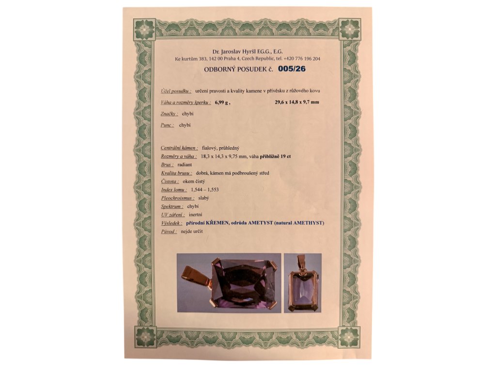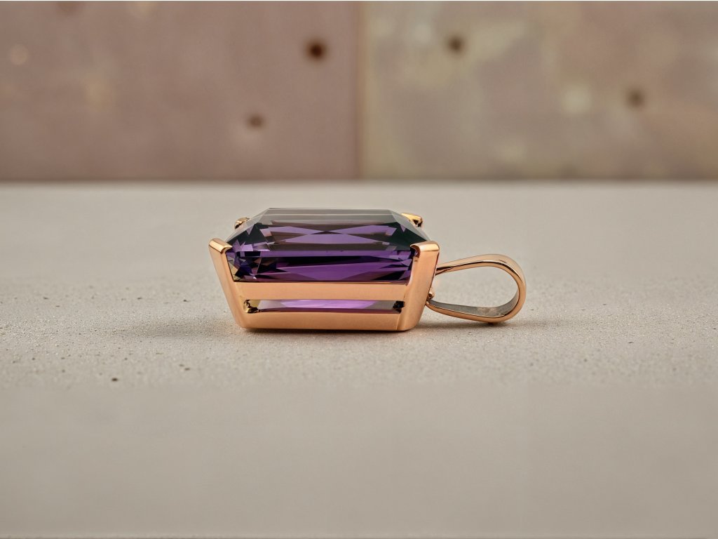 Přívěs je zhotoven z 14k růžového zlata o celkové váze 6,99 g. Teplý tón růžového zlata dokonale ladí s fialovou barvou ametystu a dodává šperku jemnost, ženskost a moderní nádech. Kvalitní zpracování a pevné uchycení kamene zajišťují nejen estetickou hodnotu, ale i dlouhou životnost šperku.