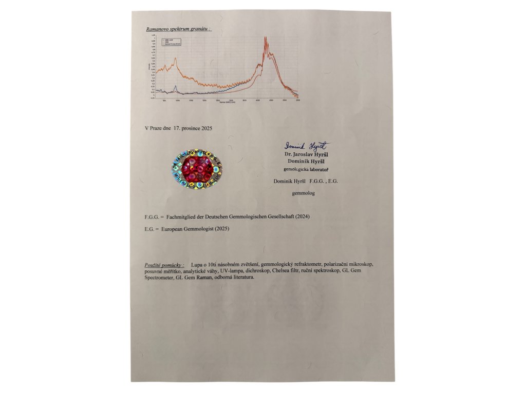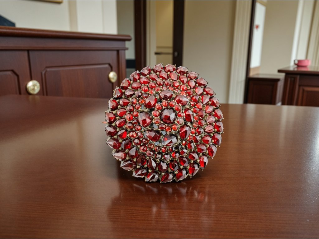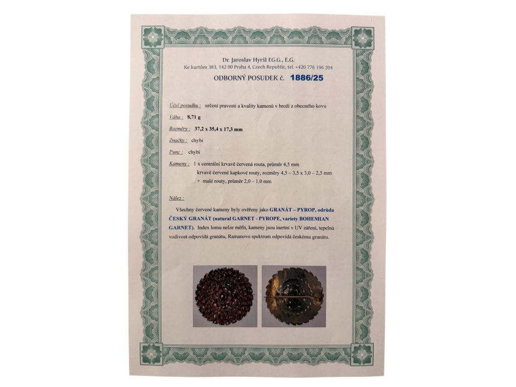 Brož o rozměrech 37,2 × 35,4 mm a váze 8,17 g je osazena autentickými českými granáty s temně vínovou barvou a vysokým brilantním odleskem. Kameny jsou ručně vsazeny do typických rozetových struktur, které jsou pro historické šperky této doby charakteristické a dodnes vysoce ceněné sběrateli i milovníky originálního designu.