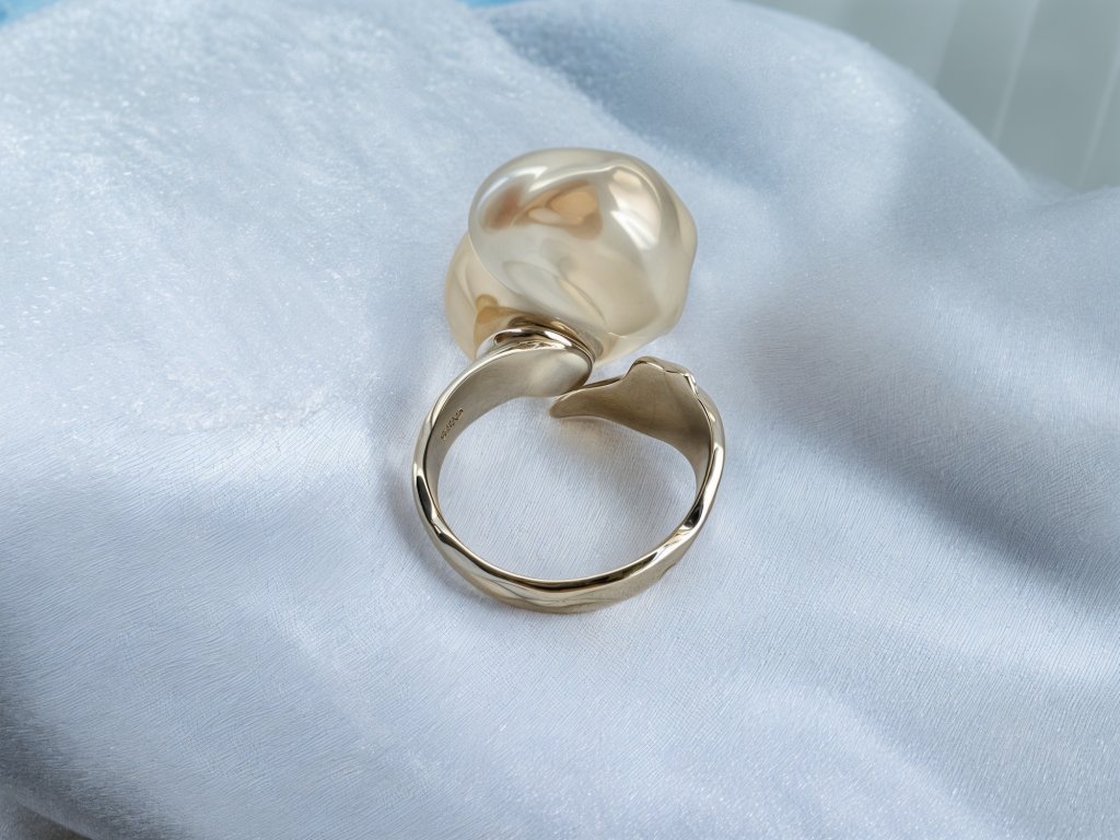 Masivní prsten je vyroben ze stříbra ryzosti 925 a jeho váha činí 11,16 g. Organicky tvarovaná obroučka připomíná tekutý kov a dokonale kontrastuje s přirozeným tvarem barokní perly. Tento moderní design podtrhuje jedinečnost drahokamu a vytváří šperk, který působí velmi současně a zároveň nadčasově.
