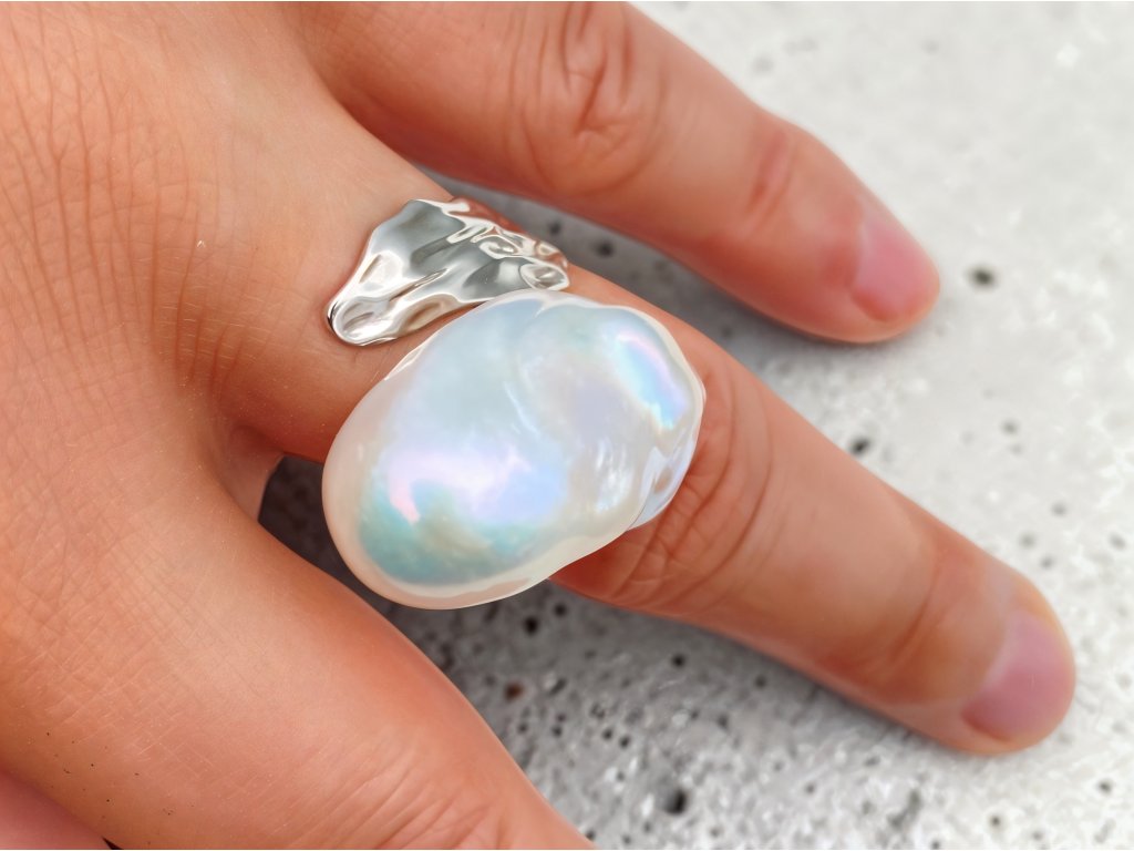 Tento výrazný designový prsten ze stříbra 925 zaujme na první pohled svou dominantní perlou. Pěstovaná barokní perla o rozměrech přibližně 25 × 16,4 × 15 mm má unikátní nepravidelný tvar, díky kterému je každý kus naprostý originál. Jemné duhové odlesky na povrchu perly vytvářejí nádhernou hru světla a dodávají šperku luxusní charakter.