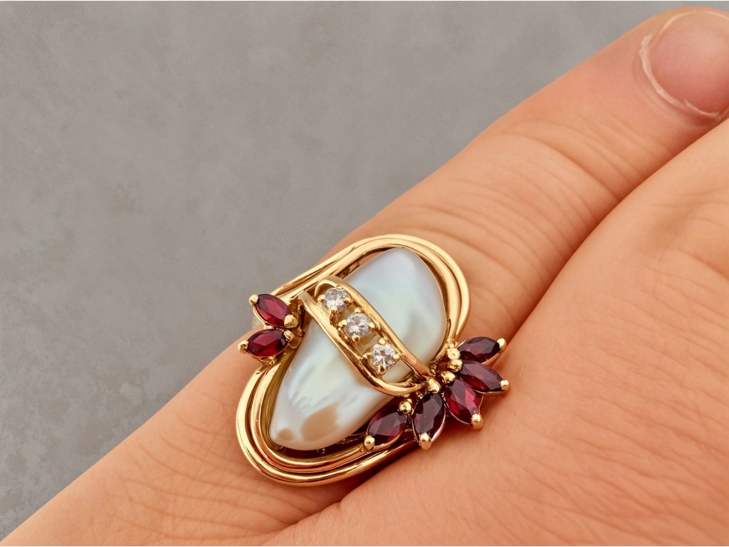 Designový Zlatý Prsten s Perlou, Rubíny a Diamanty 14k zlato, Rubíny 0,56 ct, Diamanty 0,06 ct a Perla 16 x 7 mm