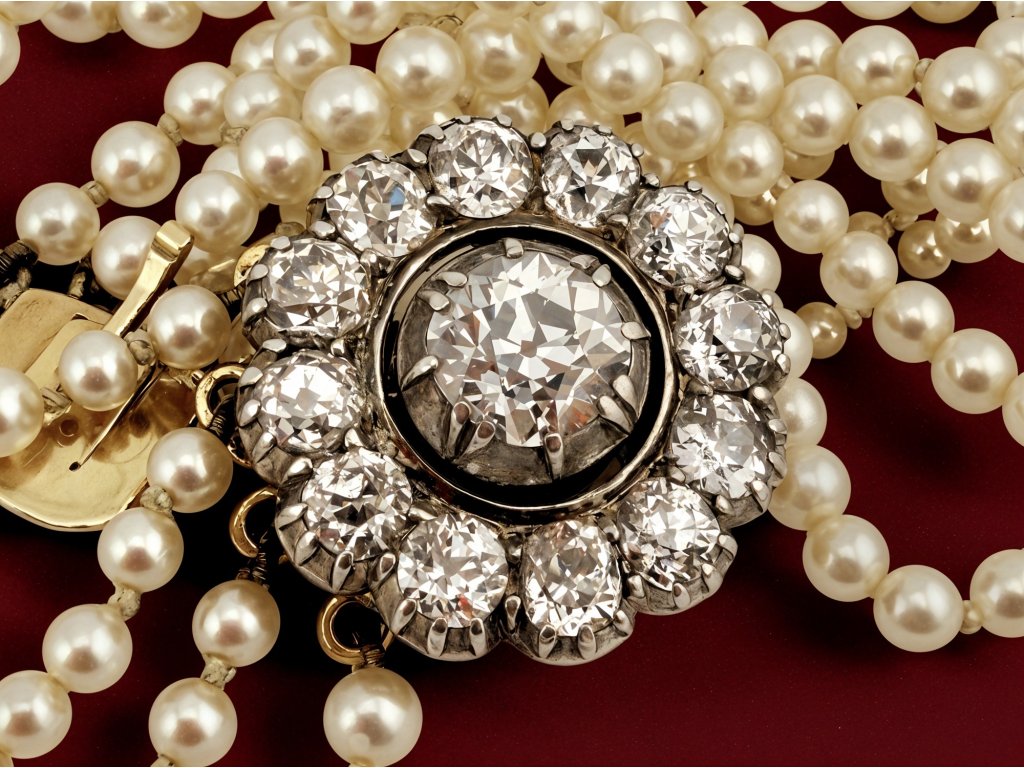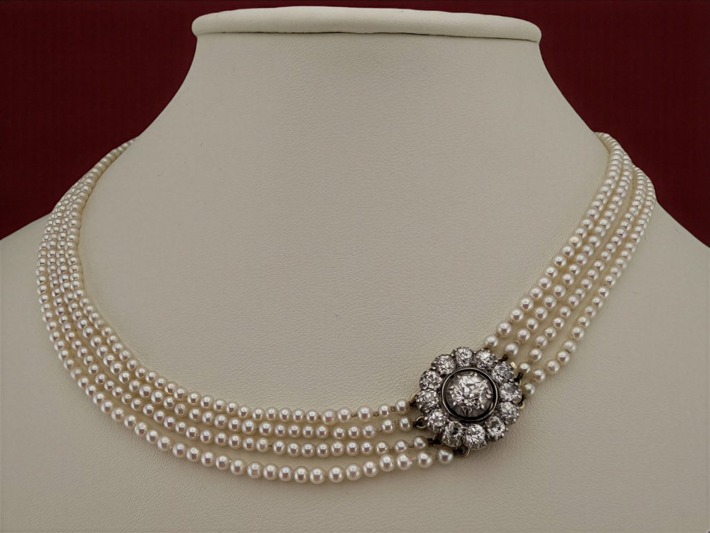 Starožitný Perlový Náhrdelník s Diamantovou Sponou - Rezervace Zlato a stříbro, Říční Perly a Diamanty 2,4ct.