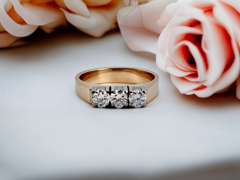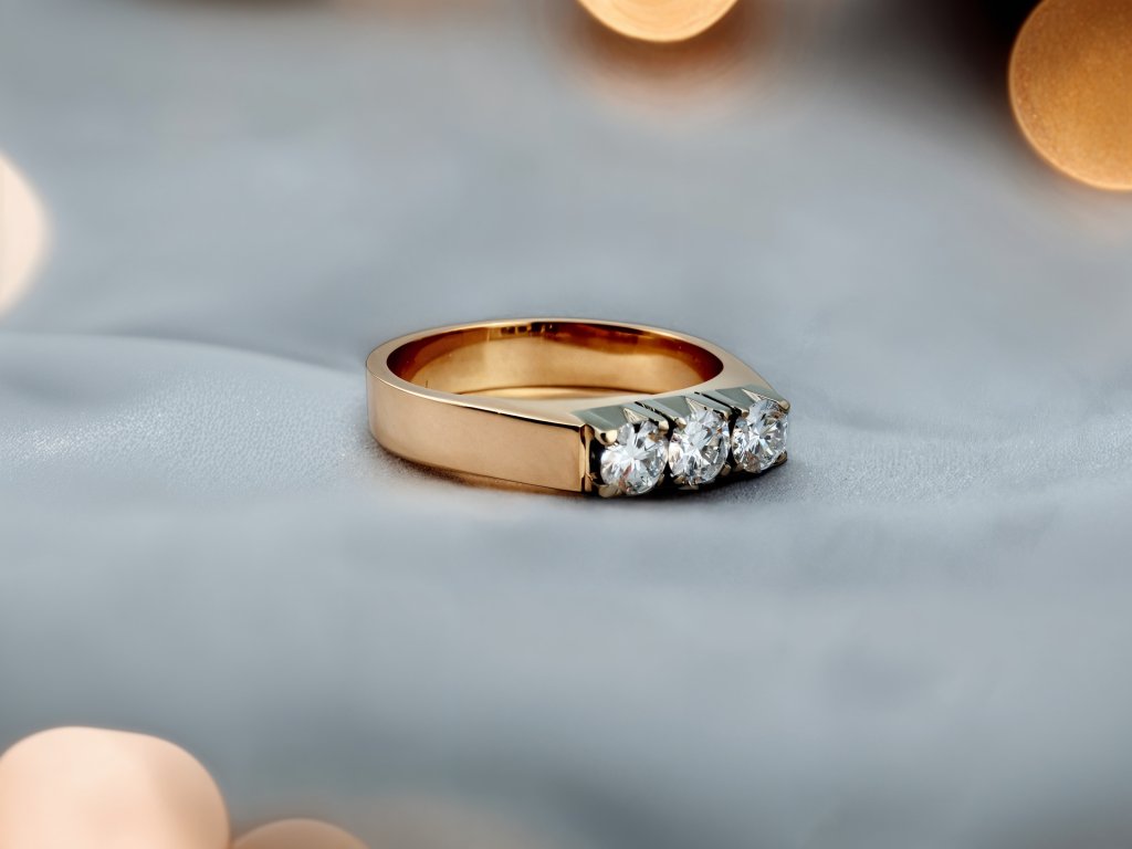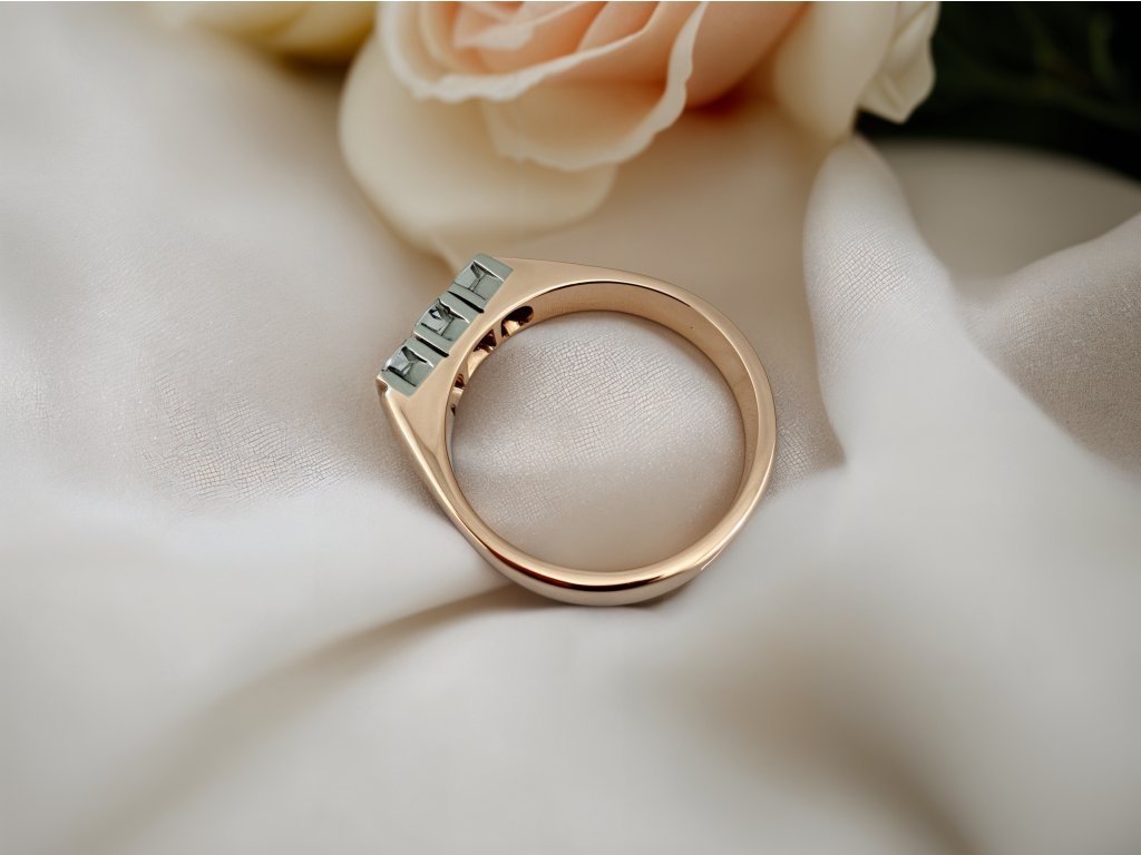 Dominantním prvkem jsou tři diamanty o celkové váze 0,48 ct v kvalitě G/VSI, zasazené do bílého zlata pro zvýraznění jejich lesku a čistoty. Trojitá kompozice kamenů symbolizuje minulost, přítomnost a budoucnost – motiv, který z tohoto prstenu činí nadčasový klenot vhodný i jako zásnubní prsten.