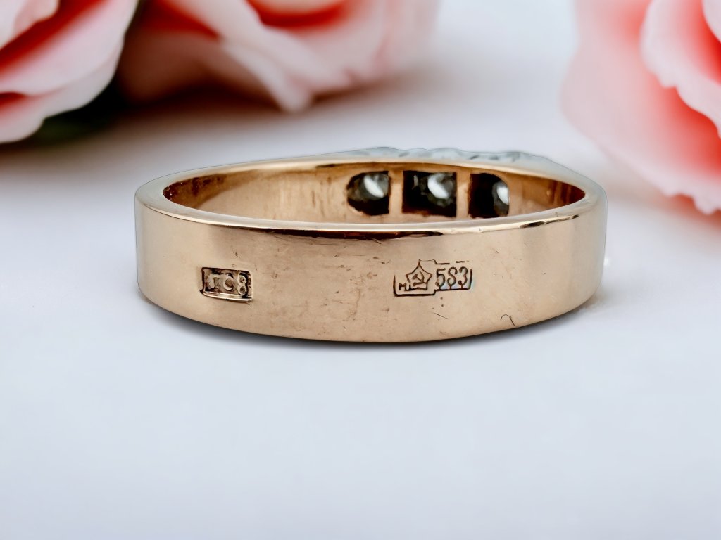 Prsten je vyroben z 14k zlata, které kombinuje červený a bílý odstín – typickou barevnou paletu pro sovětské šperky té doby. Tento kontrast symbolizuje spojení tradice a moderního designu, které se v 50. letech začalo prosazovat i ve šperkařském průmyslu Sovětského svazu.