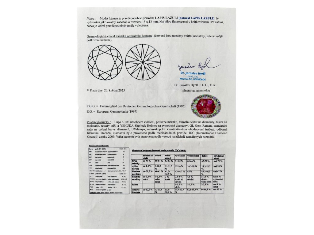 Dominantou prstenu je dokonale vybroušený lapis lazuli v sytém královsky modrém odstínu. Tento ušlechtilý kámen byl ceněn již ve starověkém Egyptě a i dnes nese symboliku moudrosti, síly a elegance. V tomto provedení tvoří harmonickou protiváhu lesku zlata.