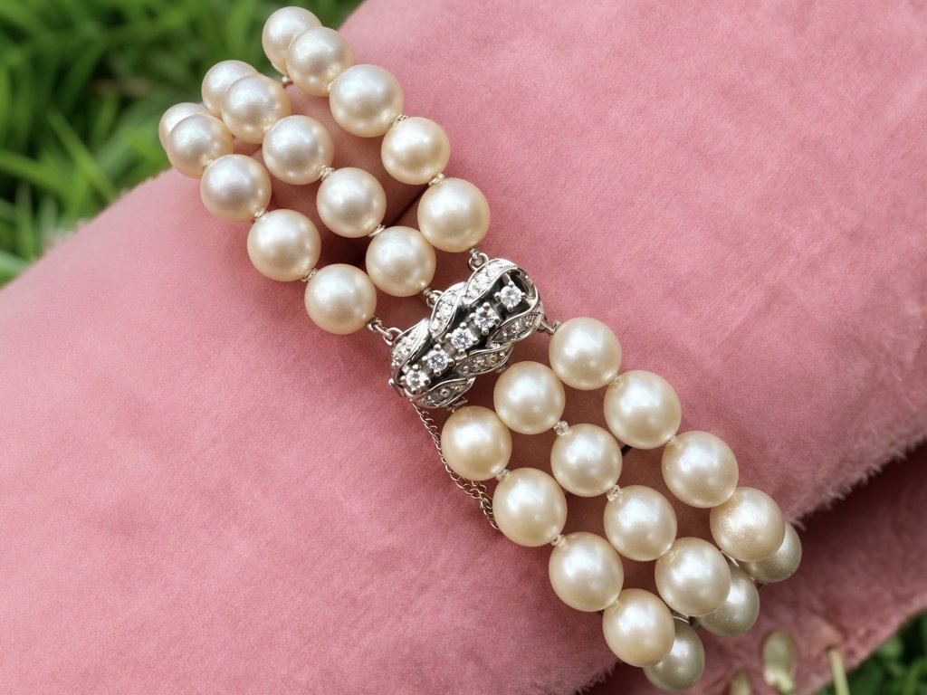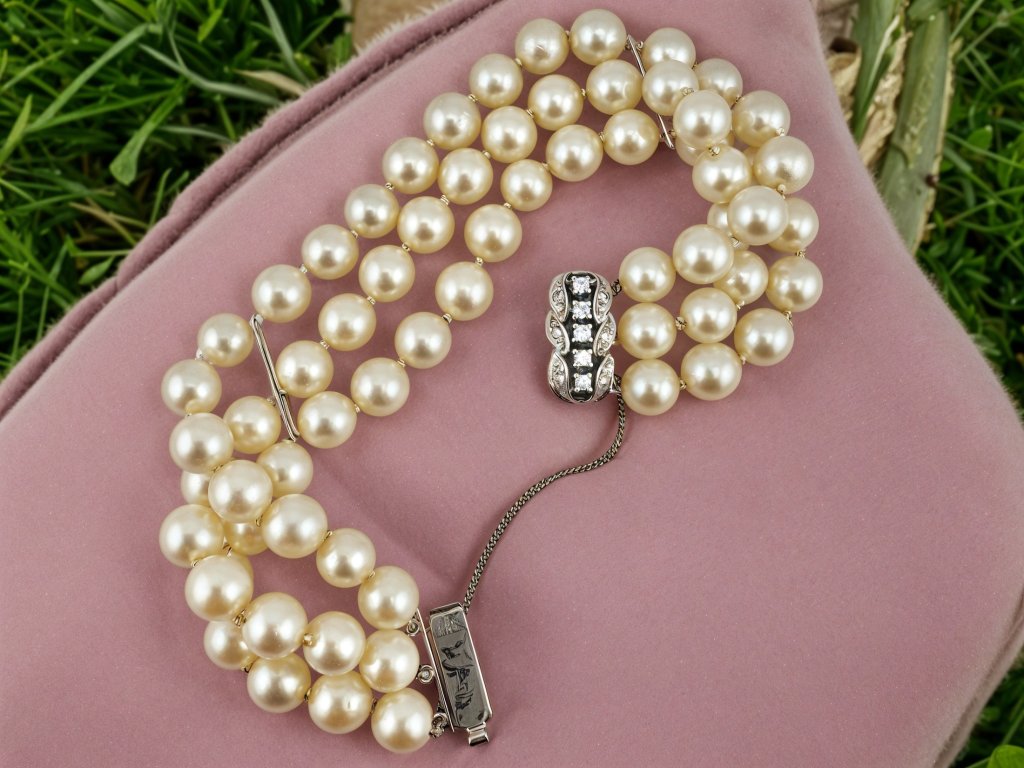 Tento výjimečný starožitný náramek z přírodních kultivovaných perel v sobě nese noblesu dávných časů. Tři pravidelné řady perel vytvářejí jemný a zároveň luxusní dojem – perly působí hedvábně, jsou krásně kulaté a jejich přirozený lesk podtrhuje řemeslnou preciznost každého uzlu. Tento šperk ztělesňuje ženskost v její nejčistší podobě.