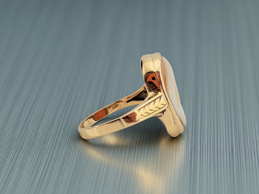 Teplý tón 14karátového zlata harmonicky doplňuje jemné krémové odstíny mušle a podtrhuje hloubku rytiny. Konstrukce prstenu je pevná a zároveň elegantní, což z něj činí pohodlný šperk pro každodenní nošení i výjimečné příležitosti.
