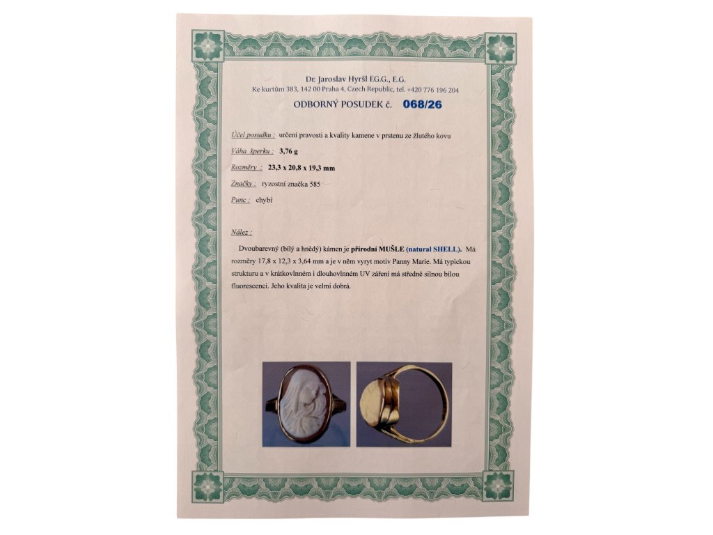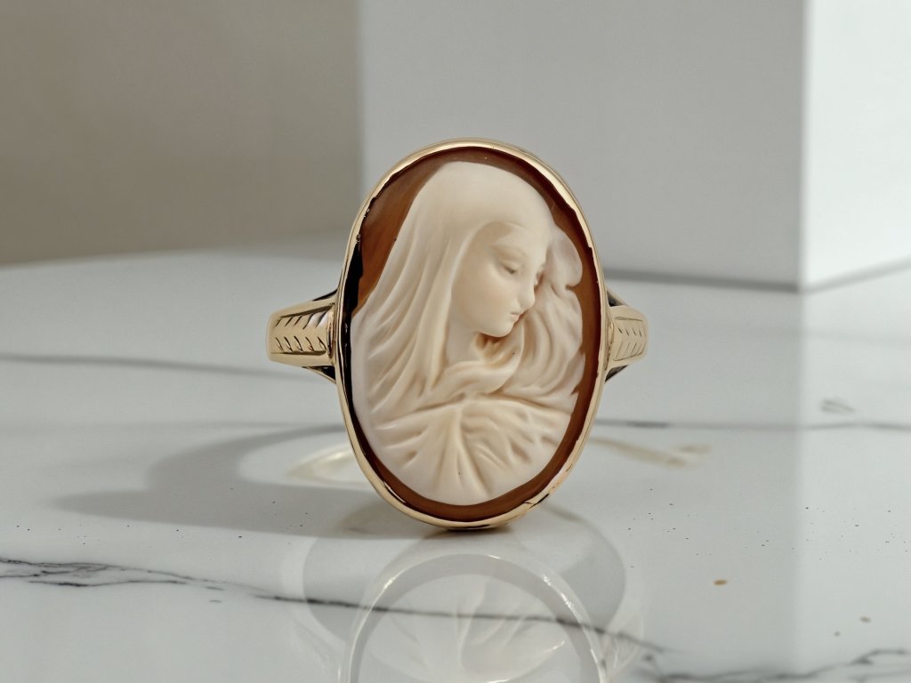 Tento starožitný prsten z 14k zlata o váze 3,8 g představuje spojení šperkařského umění a hluboké symboliky. Dominantou je ručně rytá kamej z přírodní mušle s motivem Panny Marie. Jemně modelovaný profil, sklopený pohled a detailně propracované roucho vytvářejí plastický reliéf, který působí mimořádně něžně a klidně. Každý zářez rydla je výsledkem trpělivé práce mistra, nikoliv sériové výroby.