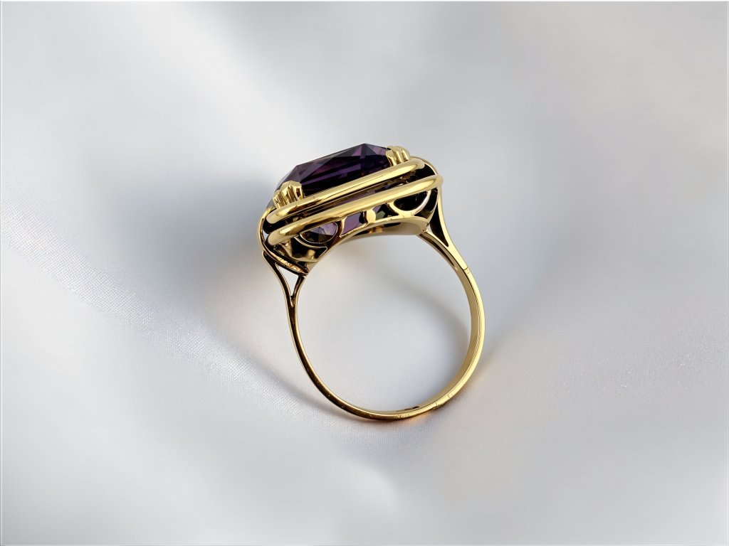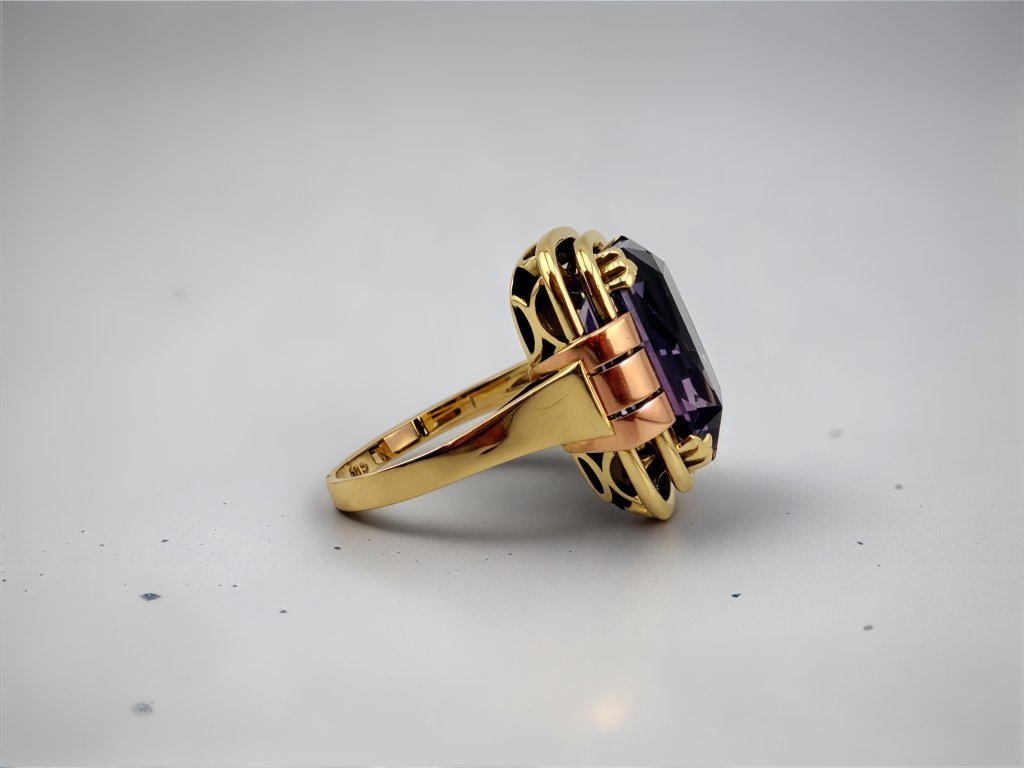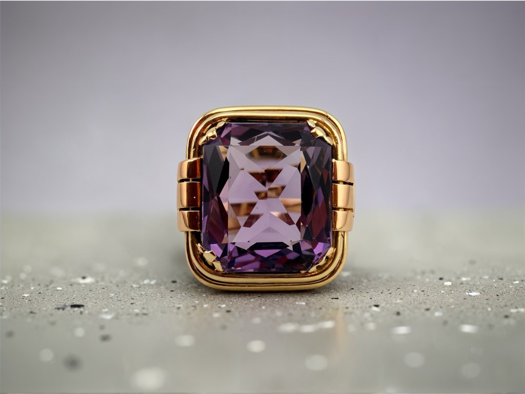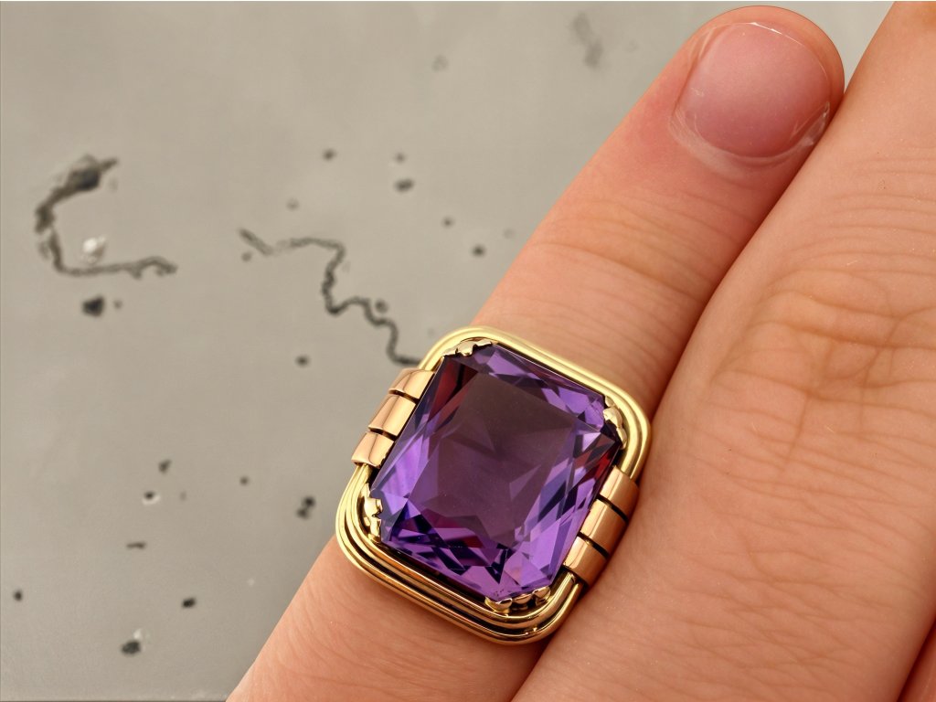 Hlavní roli zde hraje ametyst o váze 10,5 ct, který zaujme svou sytou fialovou barvou a krásným leskem. Ametyst byl v polovině 20. století velmi oblíbeným drahokamem díky své eleganci i symbolice klidu, rovnováhy a noblesy. V tomto prstenu působí přirozeně, bez zbytečných efektů, a dává vyniknout samotnému kameni.
