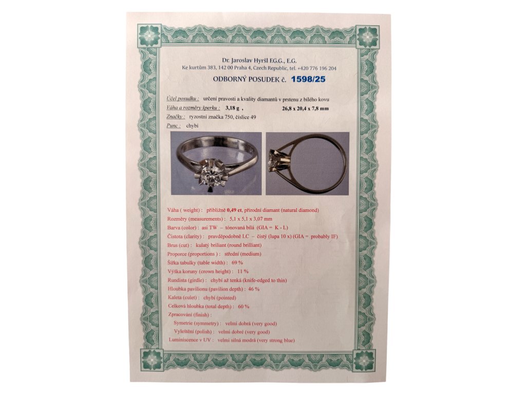 Dominantou prstenu je solitérní diamant o váze 0,49 ct, v kvalitě K/IF, který září jasem a čistotou typickou pro diamanty nejvyšší třídy. Precizní šestiúchytové uchycení nejen chrání kámen, ale zároveň umožňuje maximální průnik světla – díky tomu diamant doslova ožívá na každém pohybu ruky.