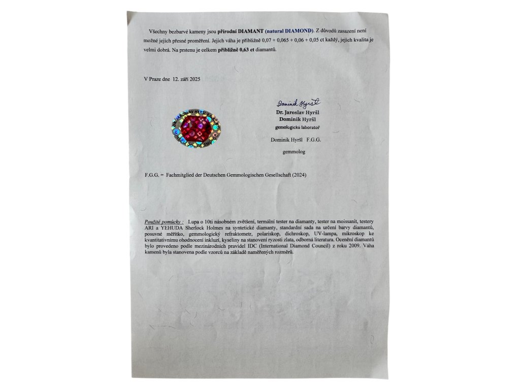 Diamanty o celkové váze 0,63ct. v kvalitě G/VS přinášejí do šperku čistý lesk a intenzivní jiskření. Každý kámen byl precizně zasazen tak, aby vynikl jeho přirozený třpyt a opticky zvýraznil elegantní linie prstenu. Diamanty jsou od nepaměti symbolem věčnosti a síly – a přesně tento pocit prsten vyvolává.
