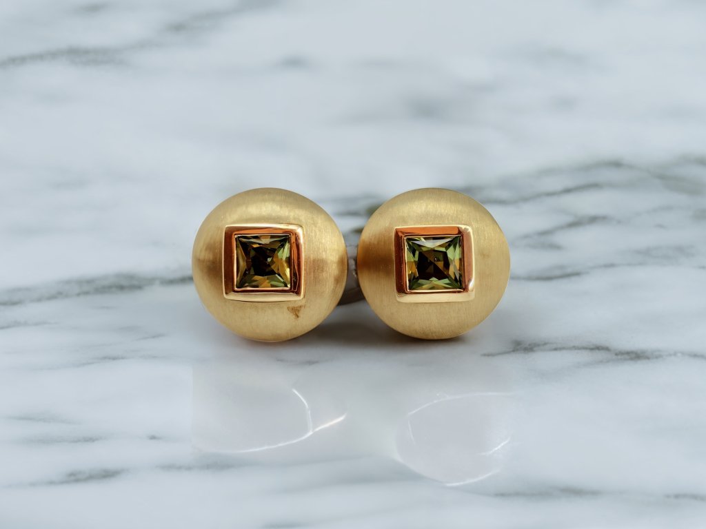Každý detail těchto náušnic je promyšlený. Klasický kruhový tvar o průměru 12 mm nechává vyniknout centrální peridot, zasazený do minimalistického zlatého rámečku.