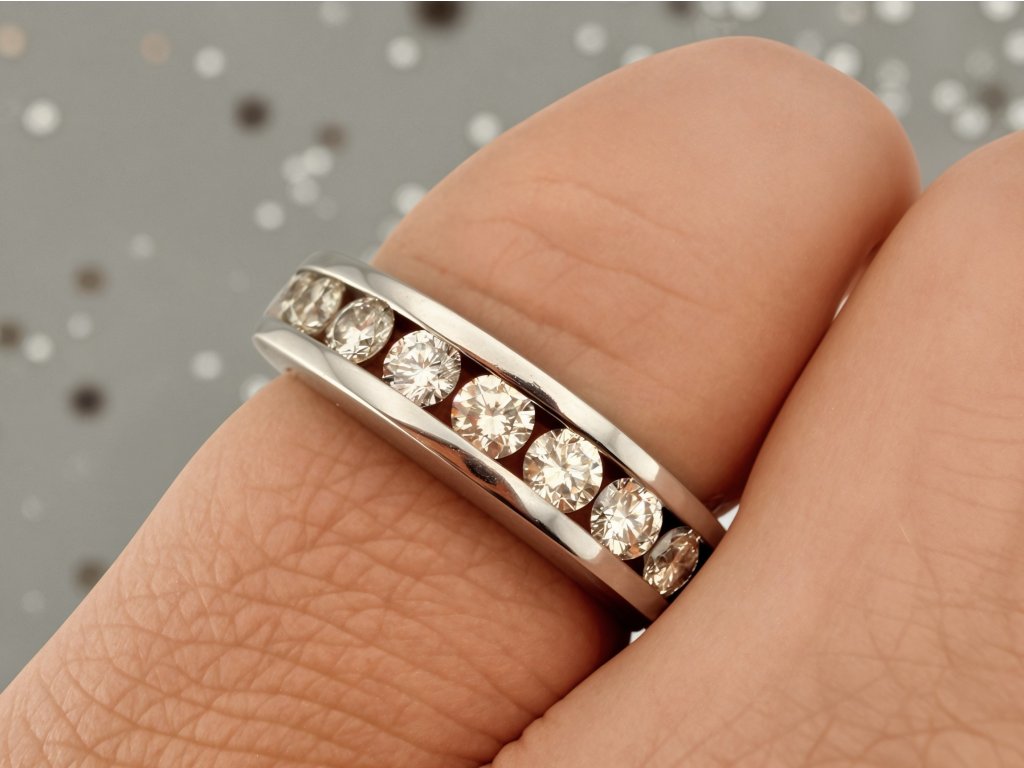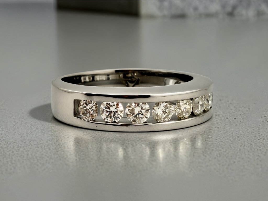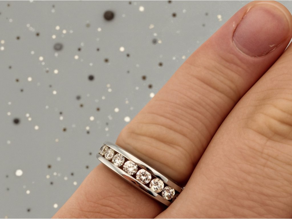 Do těla prstenu je vsazena řada přírodních diamantů o celkové váze 0,89 ct, v kvalitě H/VS. Kameny jsou uloženy v precizním kanálkovém osazení, které zajišťuje maximální bezpečnost a zároveň umožňuje vyniknout jejich přirozenému lesku. Diamanty vytvářejí jemný, ale nepřehlédnutelný třpyt, který působí luxusně a přitom velmi elegantně.