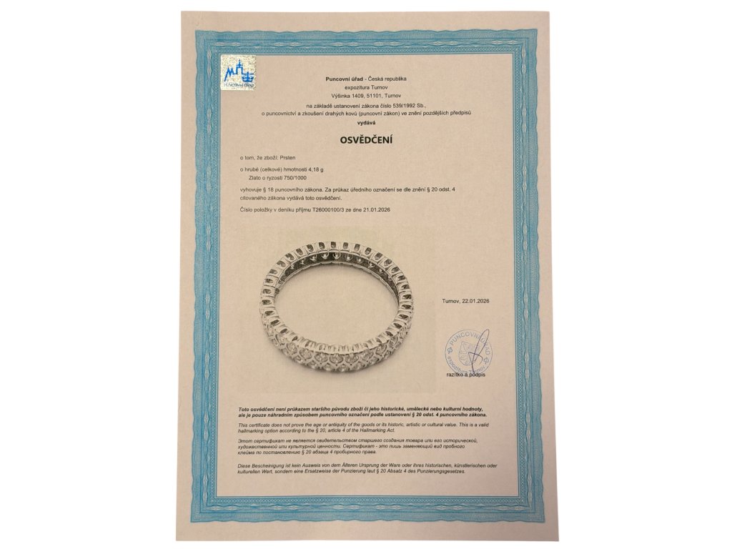 Tento luxusní memory prsten z 18k zlata o váze 4,2 gr a velikosti 62–63 je osazen po celém obvodu dokonale sladěnou řadou přírodních diamantů o celkové váze 1,98 ct v kvalitě G–H/VSI. Brilanty vytvářejí nepřerušený pás světla, který se při každém pohybu ruky rozzáří s výjimečnou intenzitou a dává prstenu charakter skutečného šperkařského klenotu.