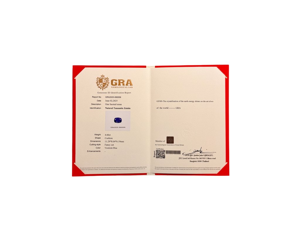 Dominantou tohoto výjimečného náhrdelníku je přírodní tanzanit o váze 4,6 ct, jehož sytá modrofialová barva patří k nejvyhledávanějším odstínům mezi sběrateli i milovníky luxusních šperků. Tanzanit je drahokam nalezený pouze na jediném místě na světě – v Tanzanii – a právě jeho vzácnost z něj činí kámen s rostoucí hodnotou. V tomto provedení vyniká svou čistotou, brilancí a noblesním leskem, který se mění podle dopadu světla.