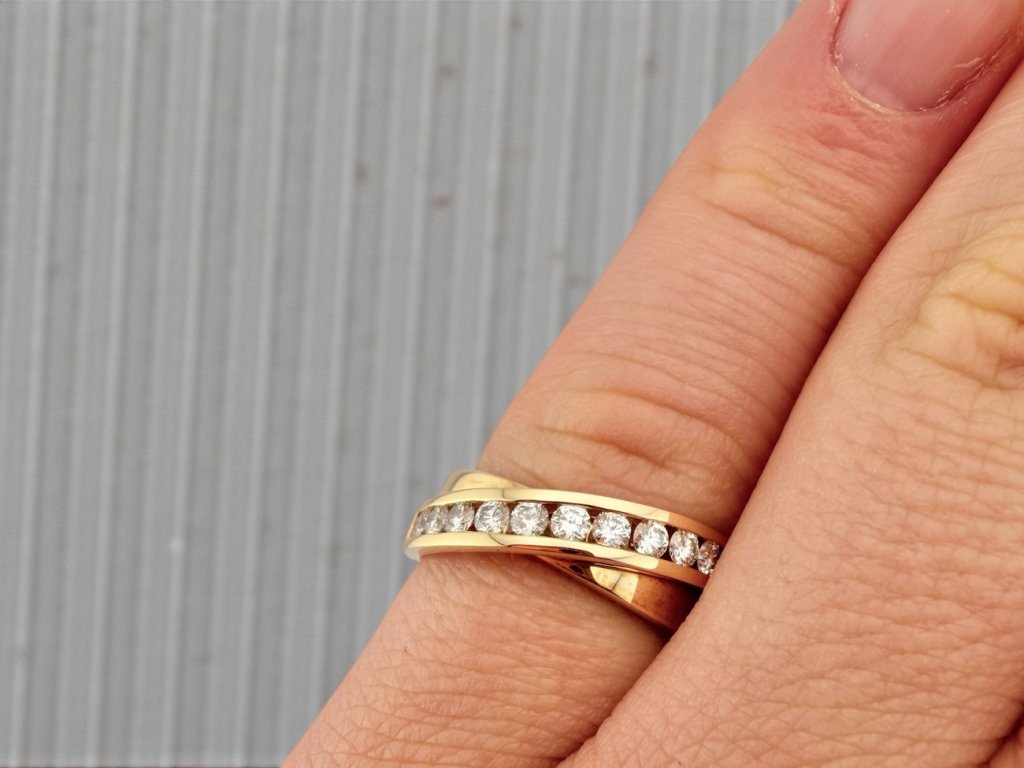 prsten je osazen diamanty o celkové váze 0,55 ct v kvalitě h/vs, které vynikají krásným leskem a čistotou. precizní vsazení podtrhuje jejich brilanci a zajišťuje, že kámen vynikne při každém pohybu ruky. diamantová linie elegantně kopíruje tvar prstenu a dodává mu jemnou jiskru, která nikdy nepůsobí přehnaně.