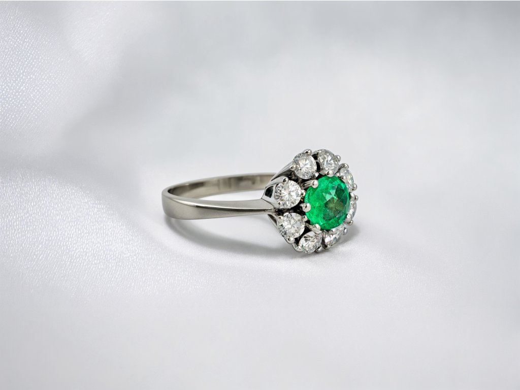 Kolem centrálního smaragdu září diamanty o celkové váze 0,52ct. v kvalitě F/VVS. Jejich jasný třpyt nádherně kontrastuje s intenzivní zelení smaragdu a společně tvoří harmonickou kompozici, která dává šperku luxusní a slavnostní charakter.
