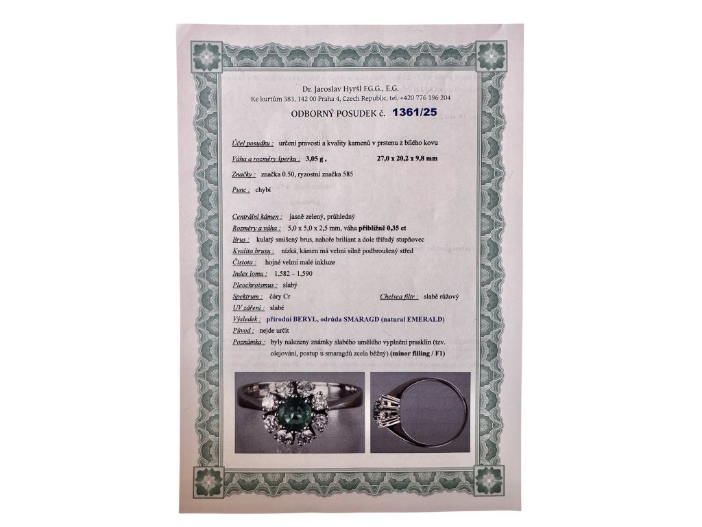 Smaragd je od nepaměti symbolem lásky, moudrosti a nesmrtelné krásy. V tomto prstenu je zasazen smaragd o váze 0,35ct., jehož sytě zelený odstín působí živě a okouzlujícím dojmem. Každý pohled na něj odhaluje hloubku barvy, která je pro tento drahokam tak typická.
