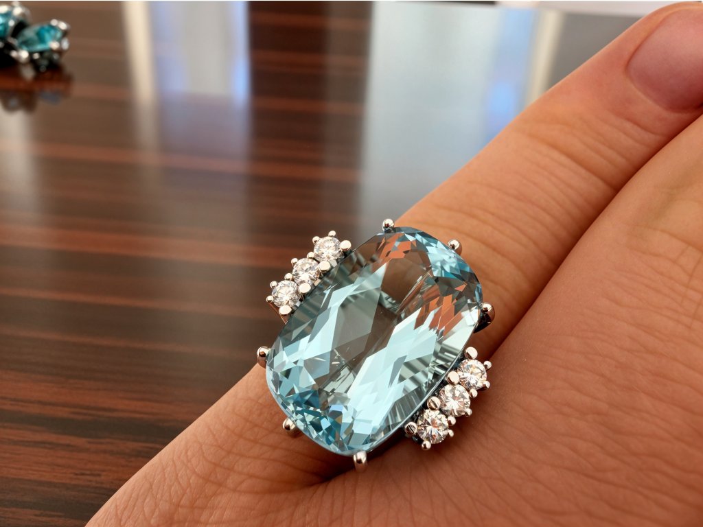 Dominantou tohoto výjimečného prstenu je přírodní akvamarín o úctyhodné váze 11 ct. Jeho světlá, čistá modrá barva evokuje klid moře a přináší pocit lehkosti a elegance. Kámen je precizně broušen tak, aby vynikla jeho hloubka, průzračnost a přirozený lesk, který se mění s dopadem světla.