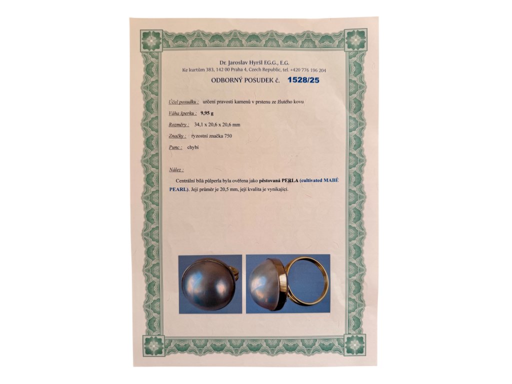 Zlatý Prsten s Topovou Mořskou Mabé Perlou 14 a 18k zlato, Mořská Mabé Perla 20,5 mm