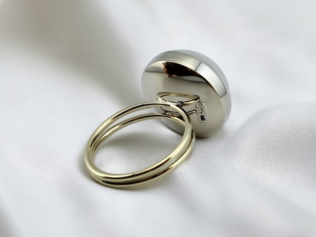 Tento výjimečný prsten zaujme na první pohled svou kombinací bílého 18k a žlutého 14k zlata o váze 10,14 gramů, která vytváří dokonalou rovnováhu mezi luxusem a elegancí. V samém středu září mořská Mabé perla o průměru až 20,5 mm – perla, která se řadí mezi ty nejvzácnější a nejde přehlédnout.