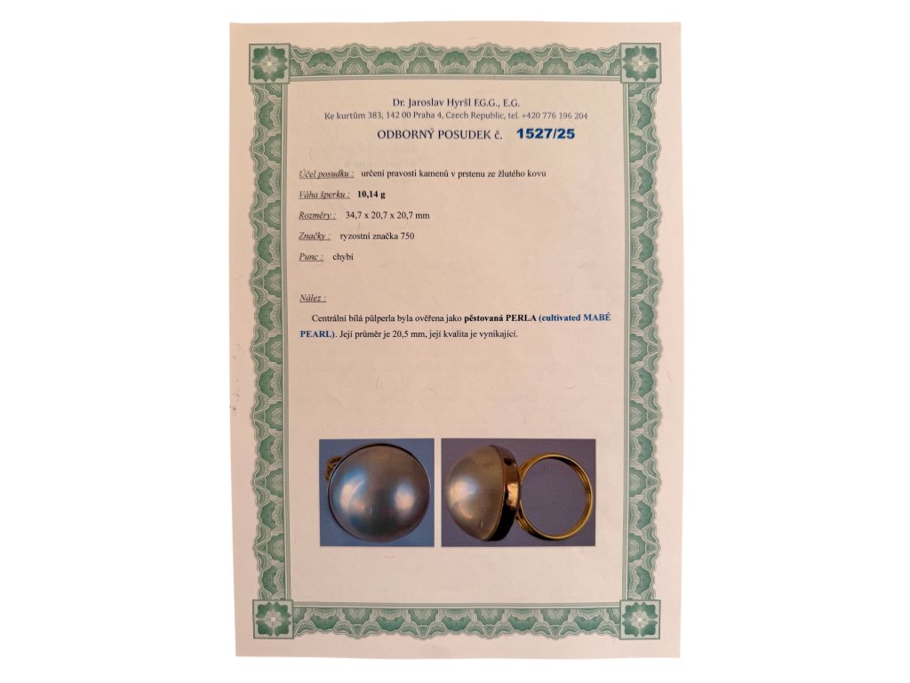 Mabé perly jsou výjimečné svým tvarem i strukturou. Na rozdíl od klasických kulatých perel mají klenutý, polokulovitý tvar, díky čemuž se často používají právě do prstenů a broží, kde dokonale vyniknou. Tento exemplář nese typický hedvábný lesk s duhovými odlesky, který prozrazuje původ z Japonska či Indonésie – oblastí, kde vznikají perly nejvyšší kvality.