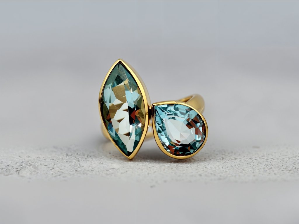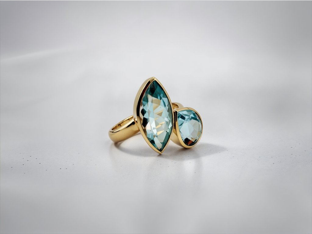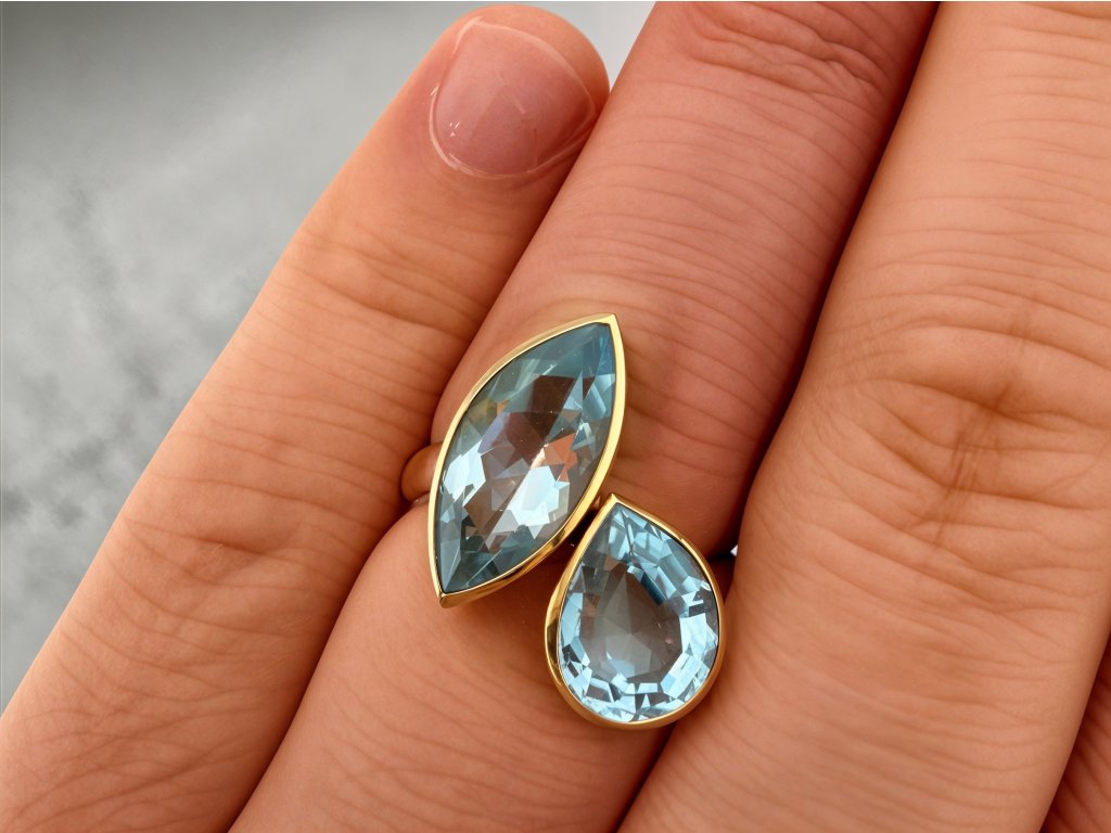 Dominantou prstenu jsou dva topazy v jemně modrém odstínu, které šperku propůjčují svěžest, lehkost a sofistikovaný vzhled. Celková váha kamenů 7 ct zajišťuje výrazný vizuální efekt, přesto si prsten zachovává elegantní a vyvážený charakter. Modrý topaz je oblíbený pro svůj klidný, čistý tón, který krásně ladí se žlutým zlatem a vytváří luxusní kontrast.