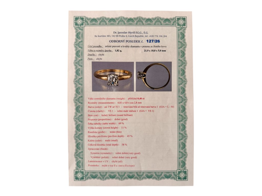 Prsten je vyroben z kombinace žlutého a bílého zlata o celkové hmotnosti 1,8 g. Bílá část zvýrazňuje diamant a dodává mu opticky větší objem, zatímco žluté zlato přidává šperku teplo a klasický charakter. Jemná obroučka zajišťuje pohodlné nošení a nadčasový vzhled.